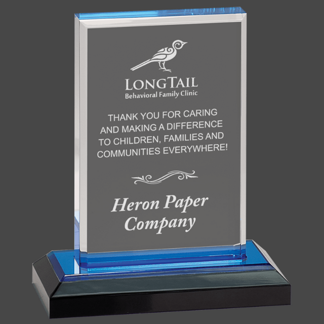 These custom acrylic awards feature a clean, modern design with clear acrylic and a colored base. Each piece is laser engraved in-house with your personalized text or logo, making them ideal for employee recognition, corporate awards, school achievements, and special events.