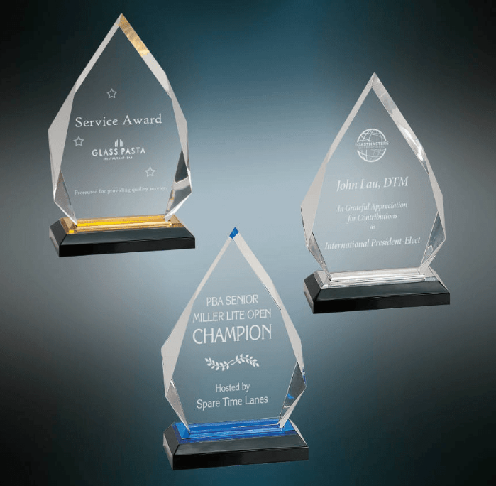 Each award features a faceted diamond-style acrylic top paired with your choice of Silver, Gold, or Blue base, creating a clean, professional presentation that looks great in any office or home.